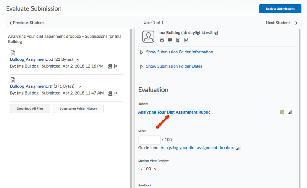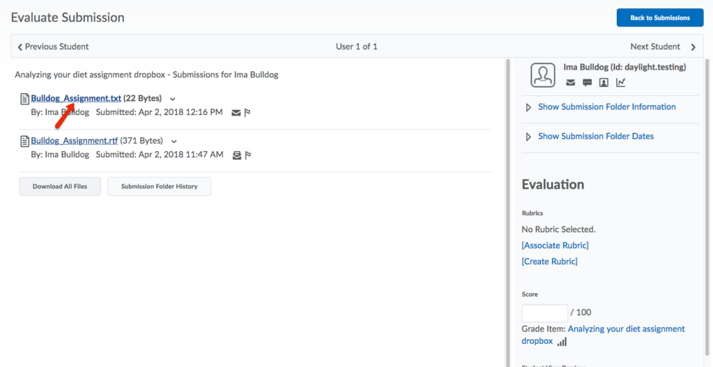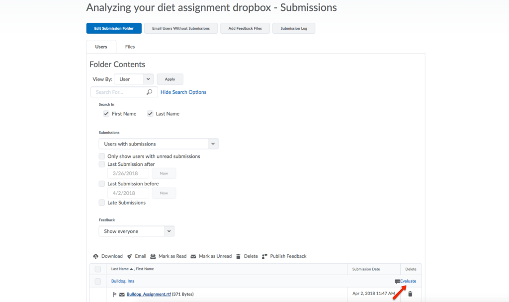 - Locate the student’s submission you would like to assess. Click Evaluate to view and grade the submission.