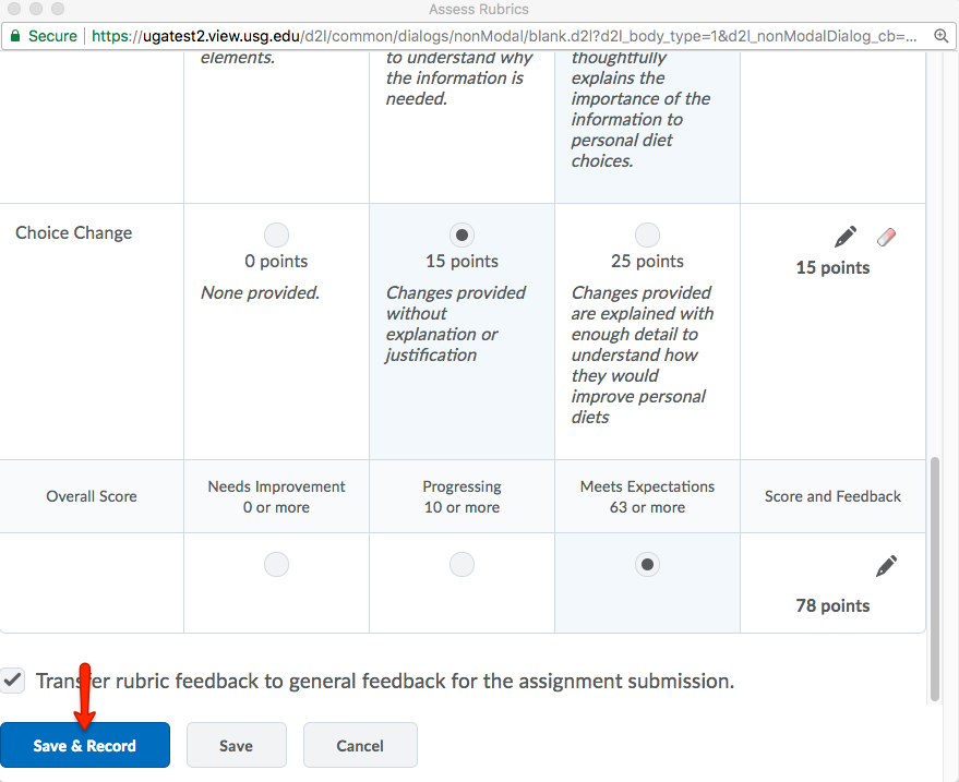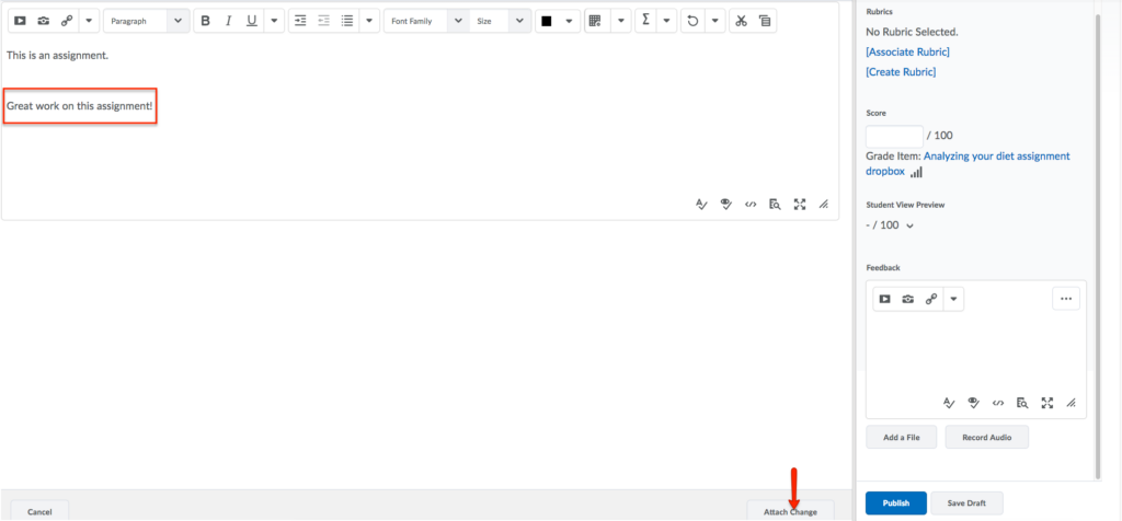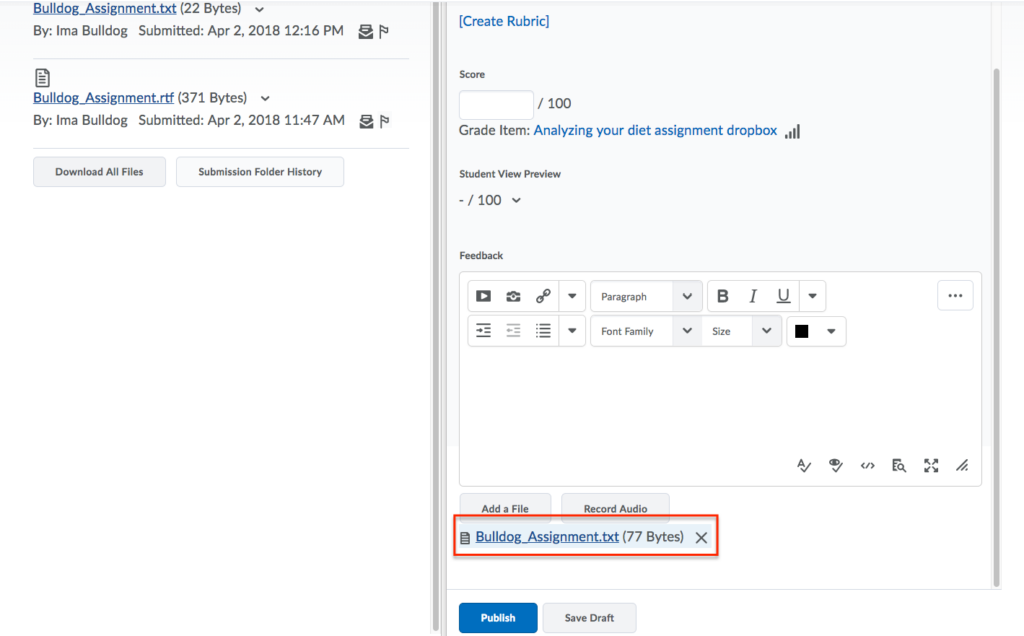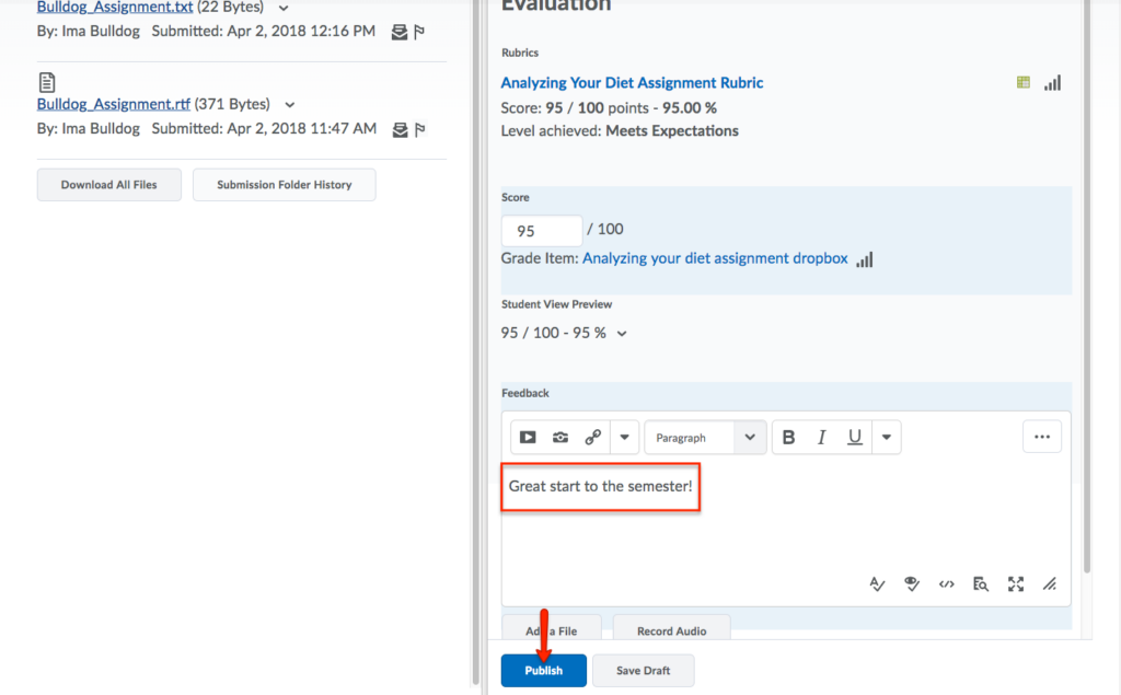 - Using the rubric, evaluate the student. The scores you entered will be transferred to the overall grade. Select Save draft if you want to save your changes and publish later. Select Publish if you are ready for the student to see your feedback and grade.