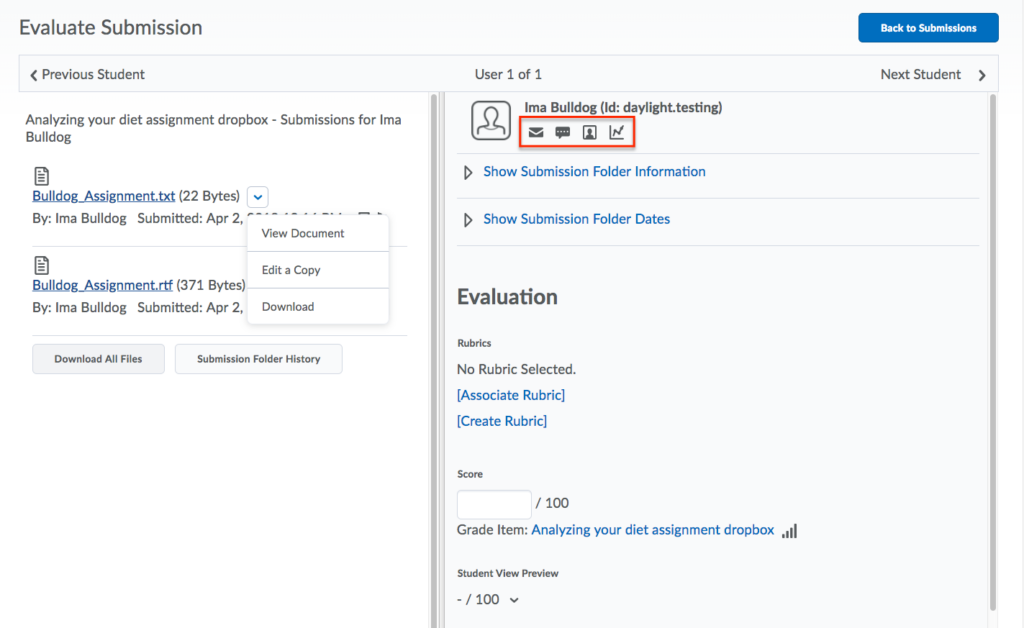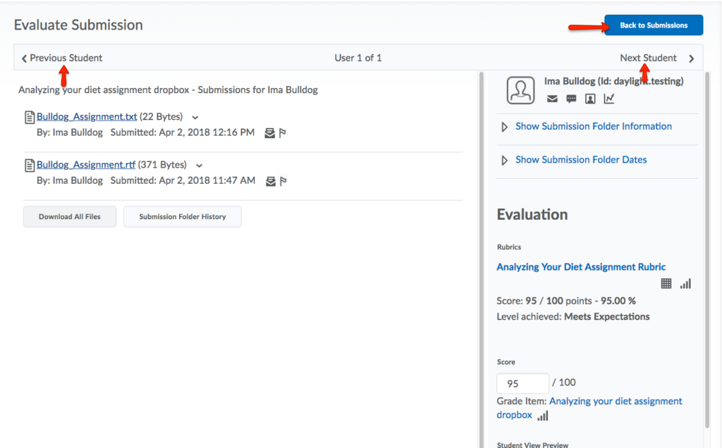 - Use the navigation panel to move to the Previous Student, Next Student, or return Back to Folder Submissions.