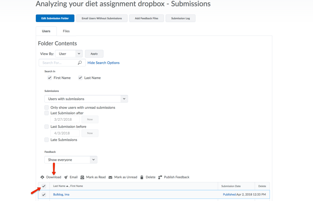 - Scroll down to the submitted files, and check the box above the submissions to select all submissions. Click the Download at the bottom of the list.