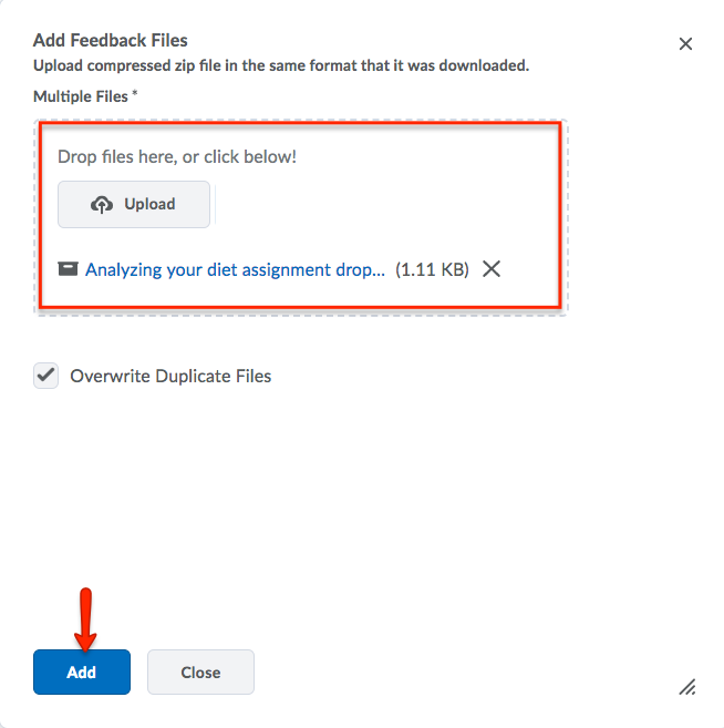 - Upload the documents with feedback. You can either drag and drop them into the box or click Upload to locate and select them on your computer. Click Add.