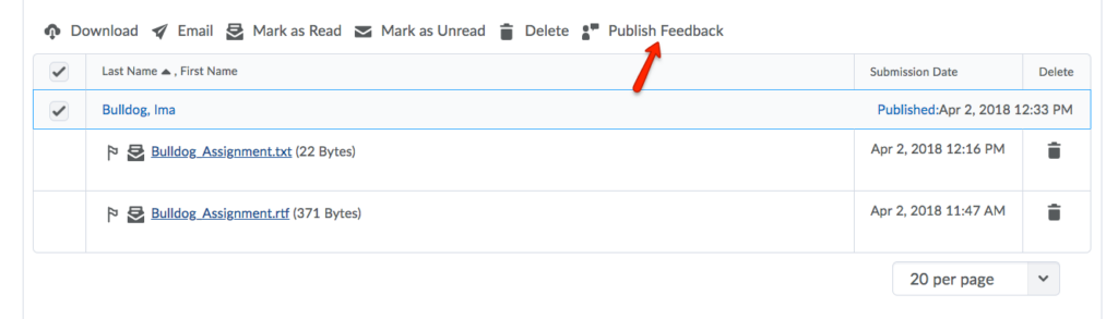 - To make your uploaded feedback files available to students, scroll down to the submitted files area and check the box to select all students. Click Publish Feedback.