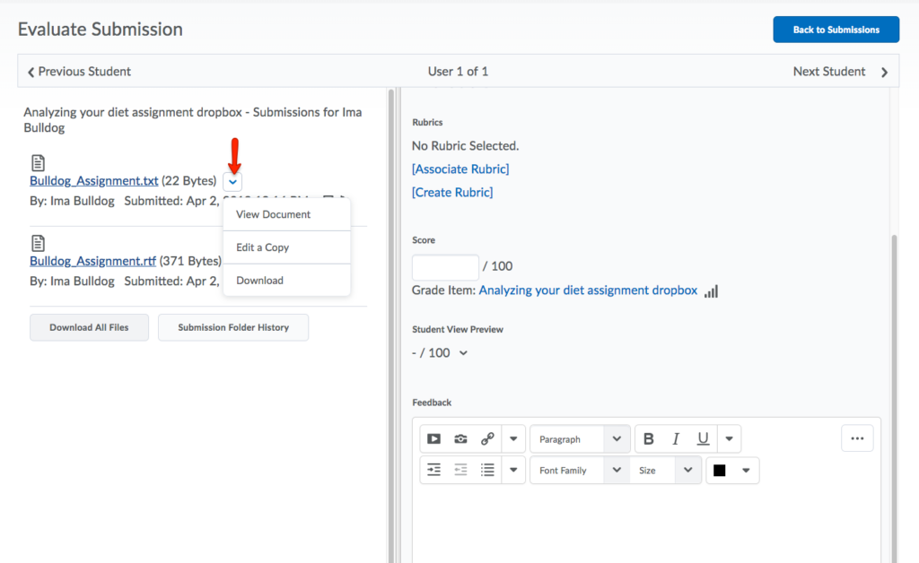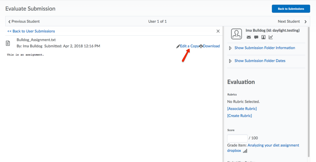 - Within the Submissions Panel, you can annotate a user’s web and plain text file submissions with the HTML editor and attach those annotations as part of the feedback. To do this, first, click the submission.