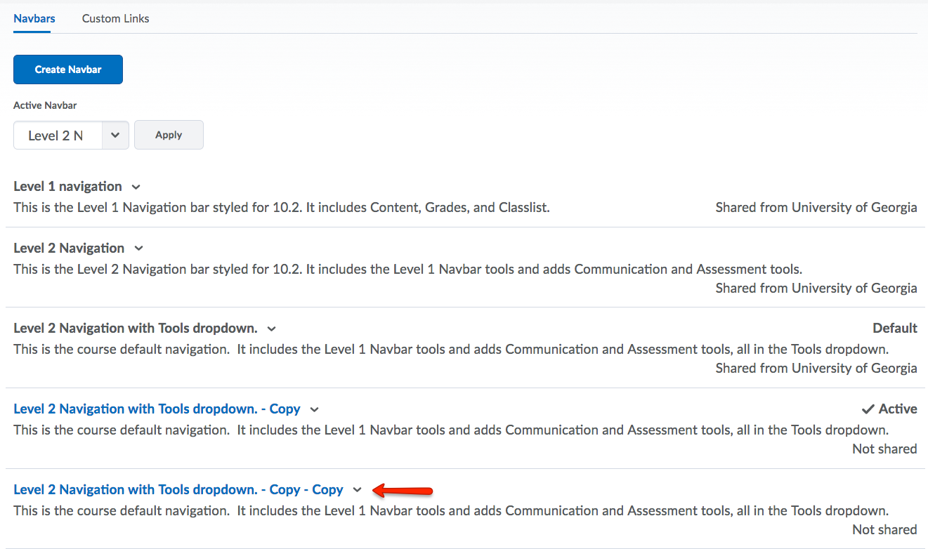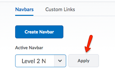 - To select an existing navigation bar for your course, choose an existing navigation bar from the Active Navbar drop-down menu. Click Apply.