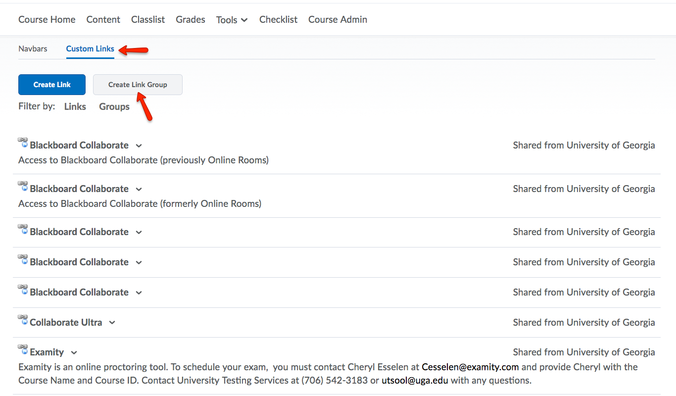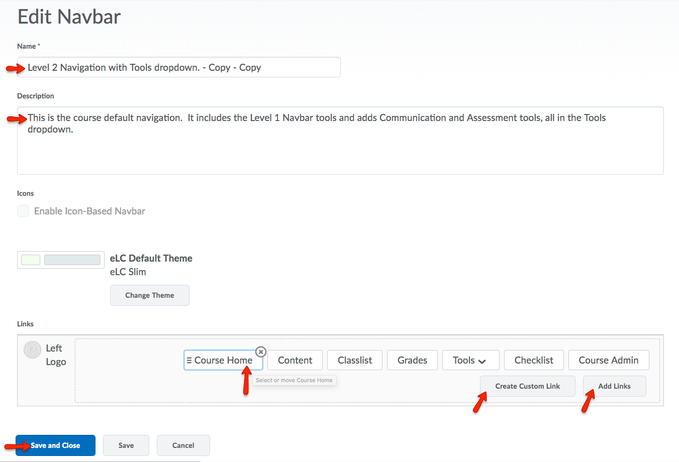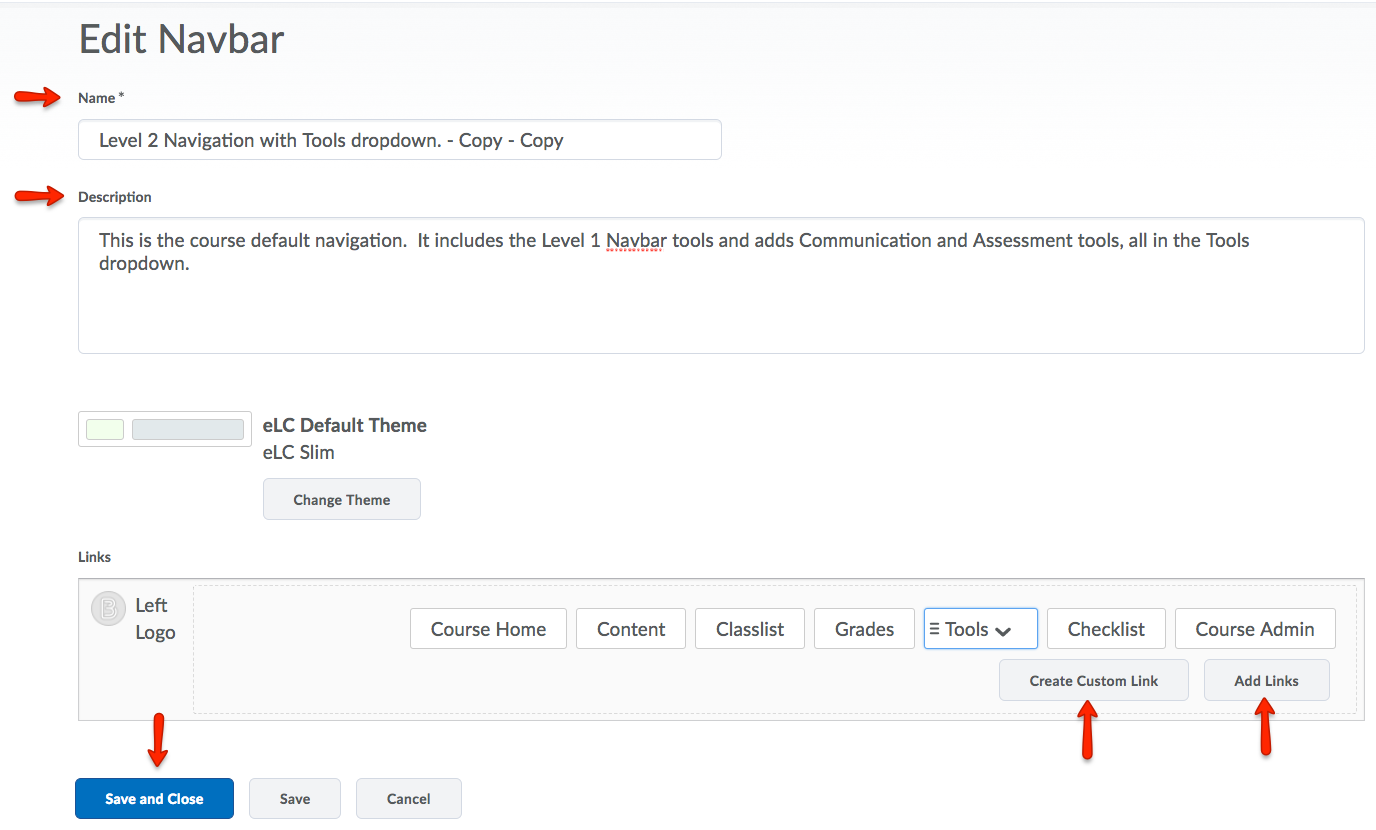 - You can also create custom drop-down menus for your navigation bar, known as Link Groups in eLC. To create a Link Group, click Navigation and Themes from the Course Administration Widget. Then click the Custom Links tab. Click Create Link Group. Then you can name your link group and add system links or custom links. Once you have created the link group, it will be available for you to add to a customized navigation bar.