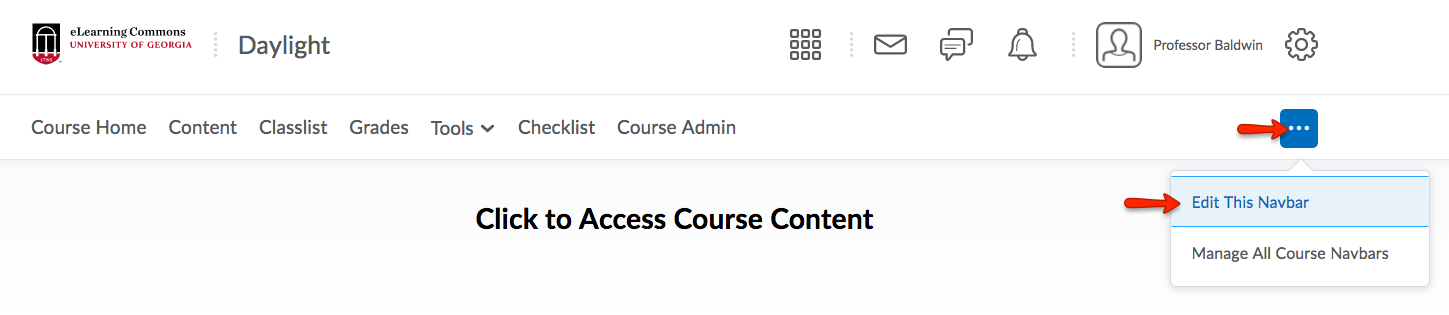- To edit the current navigation bar, first, click the … icon that appears when your mouse hovers over the Course Navbar. Select Edit This Navbar.