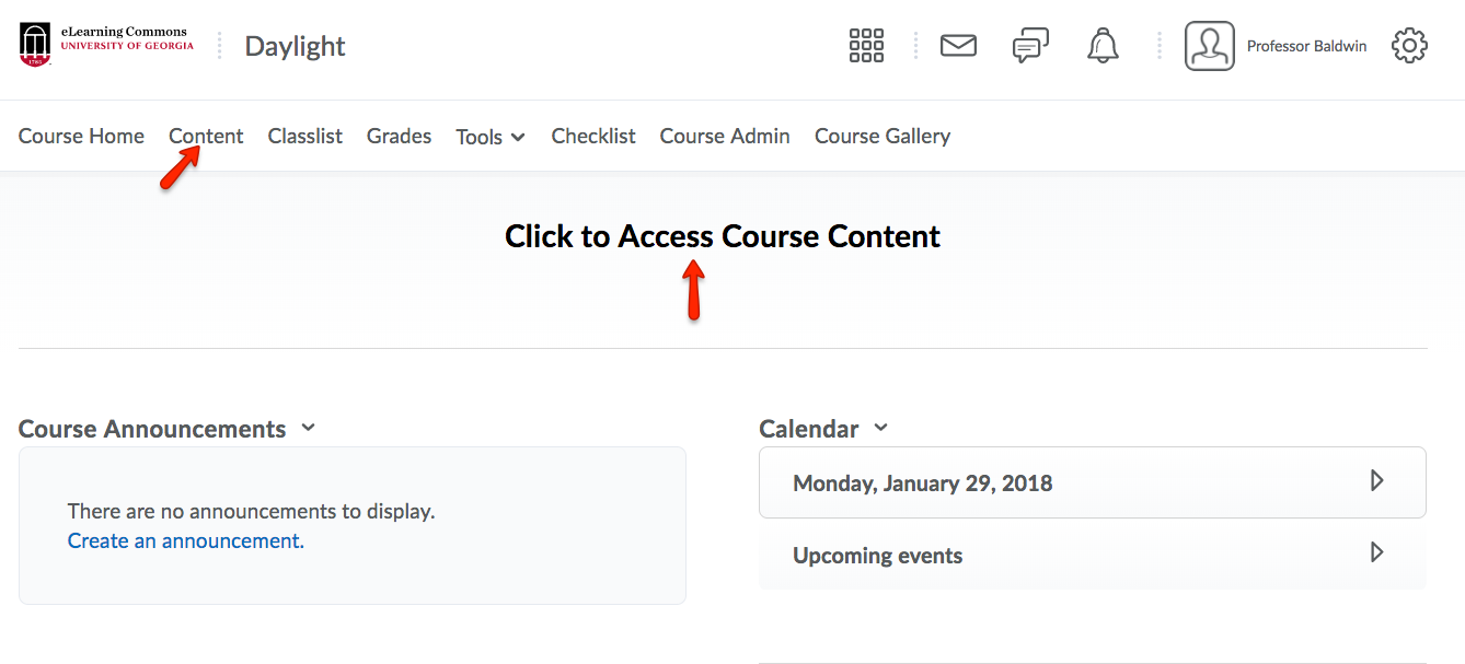 - First, navigate to the desired course, and access the Content tool by selecting Content from the course navbar or clicking Click to Access Course Content.