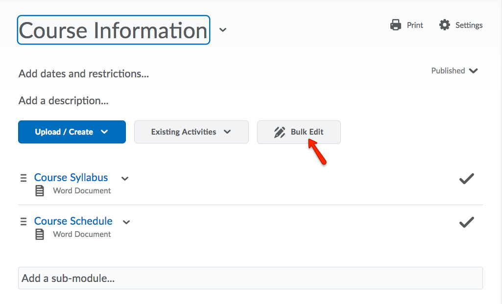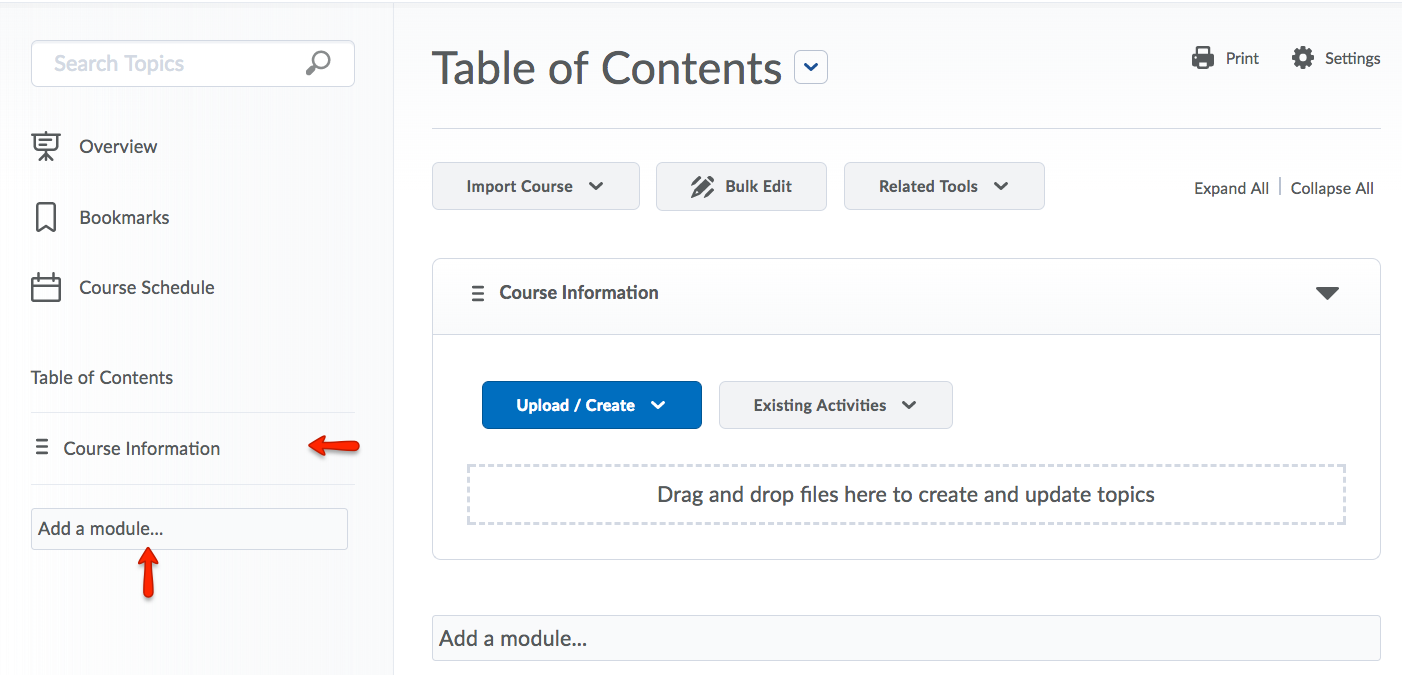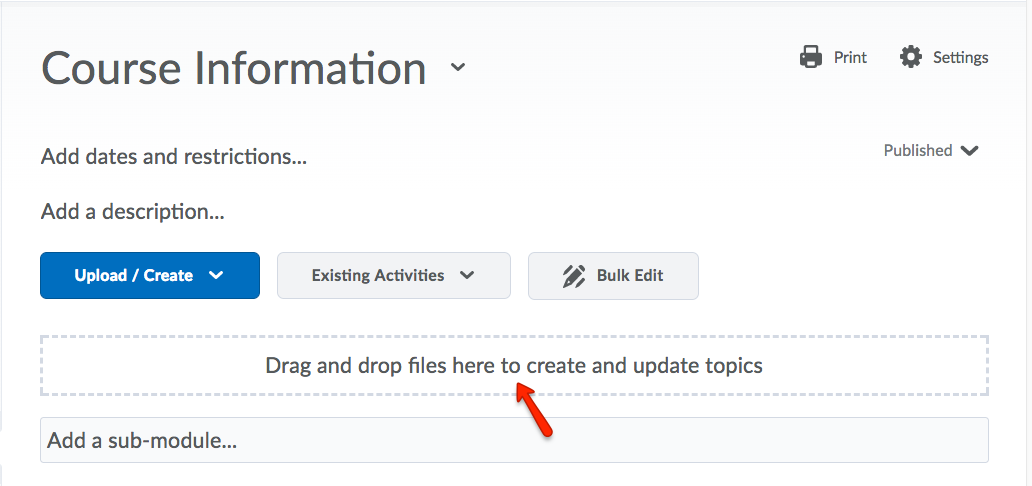 The following tutorial outlines the steps necessary to add a topic within a module and add a file within that topic. However, if you would like to upload files in bulk, refer to the tutorial below.