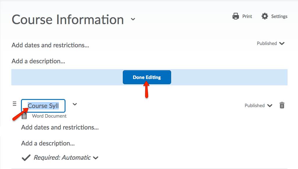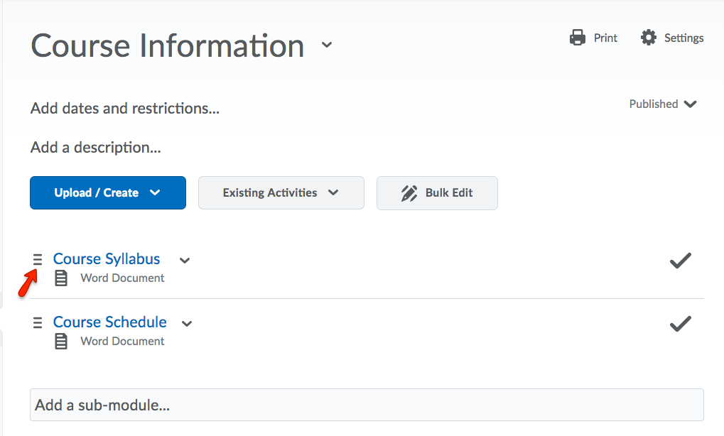 - To add files to your Content area, you must first create at least one Module (See above on Creating and Customizing Modules). If you already have a module, click on it to make it the active module.