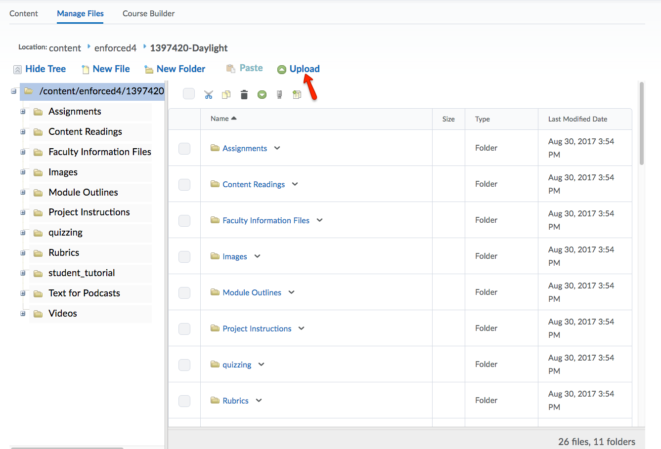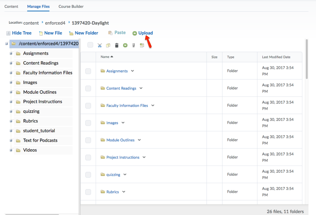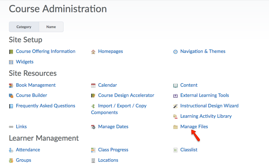 If you would like to bulk upload files in the form of a zip file or multiple files to the content of your course, the Manage Files tool is a system that can assist in this process. The Manage Files tool is a file management system for your course that can be used to organize and upload files associated with your course offering.
