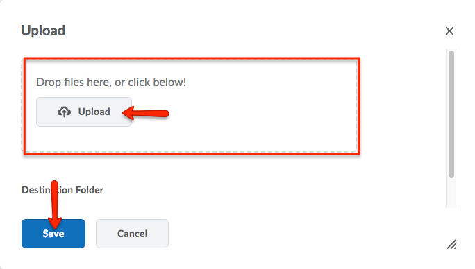 - Drag and drop desired files into the Upload area or click Upload. After clicking Upload, locate the files in your computer, and click Open. After either dragging and dropping or clicking upload, click Save to upload the file(s).