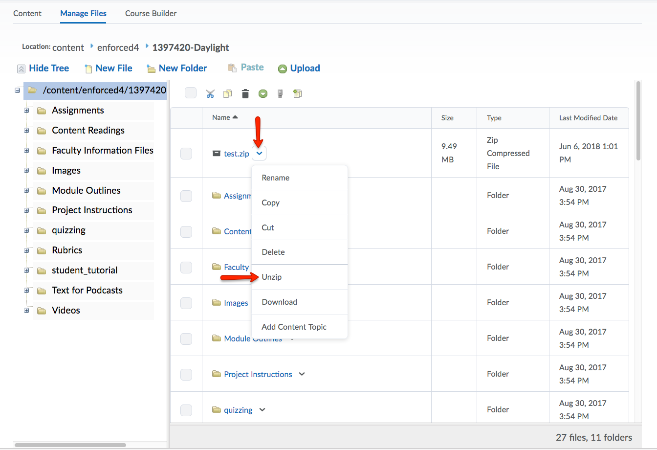 - To unzip uploaded zip files, click the dropdown menu of the content item, and select Unzip.