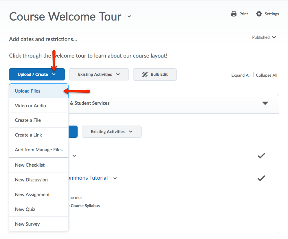 - These files can then be added to content within a previously created topic by, first, clicking Upload/Create, and select Upload Files.
