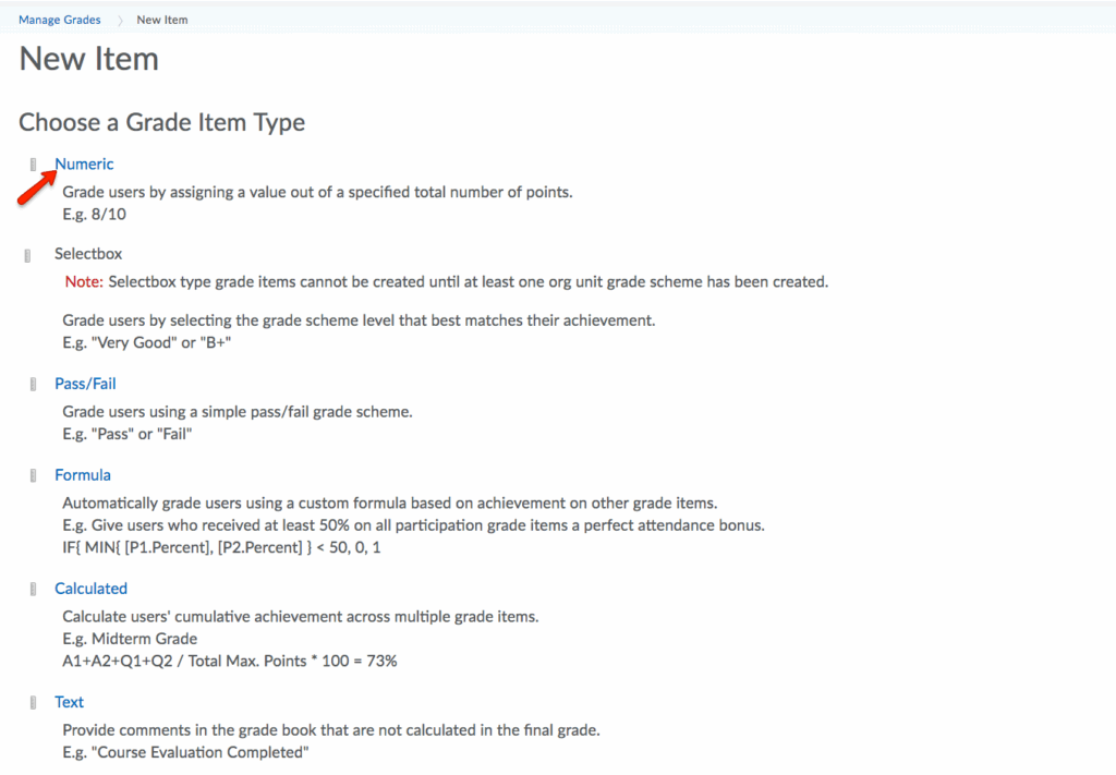 - There are many Grade Items to choose from. Usually, the choice will be Numeric. For this demonstration,Numeric will be selected for the Grade Item Type.