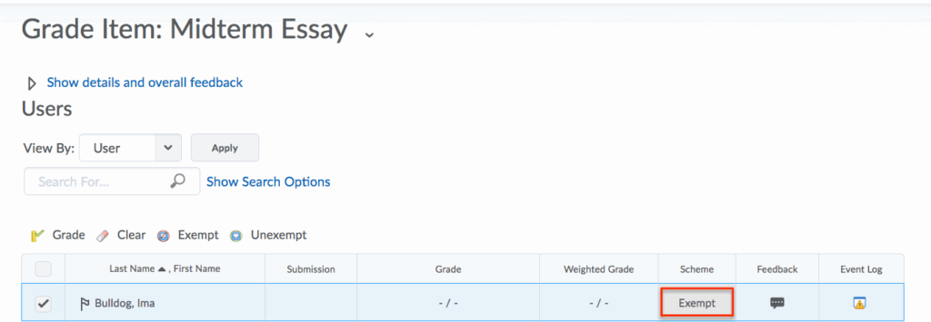 - Exempt should now be displayed in the Weight category of the grade item you selected for the student’s exemption.