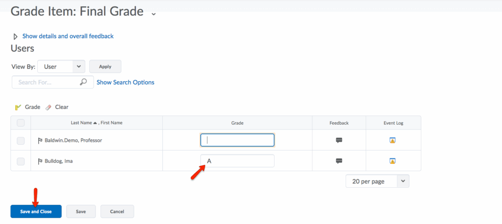 - Enter the letter grades on the Users screen. Click Save and Close when you are finished.
