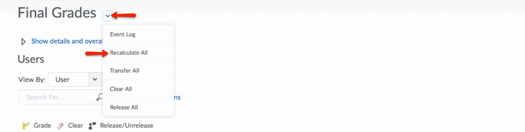 - Select Recalculate Al from the Final Grades dropdown menu.