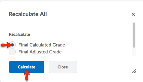 - In a new window, under Recalculate All, select Final Calculated Grade. Click Calculate.