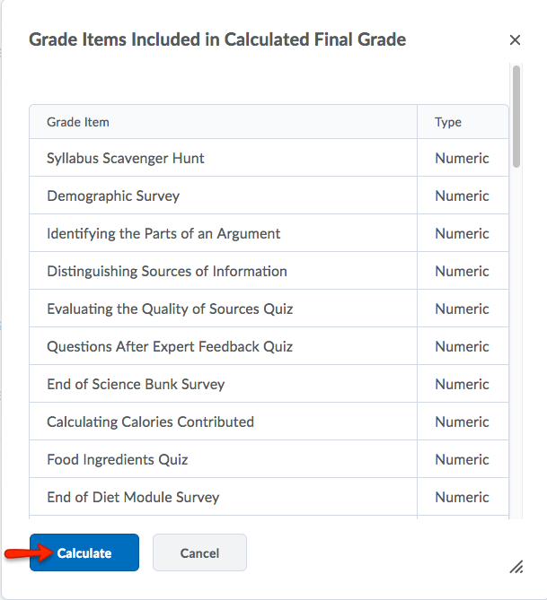 - You will now see a list of all grade items included in the Calculated Final Grade. If you would like to remove anything from this list, you will need to return to your gradebook, select to edit the relevant grade item, and select Exclude from Final Grade Calculation. Then repeat steps 1-4 above and review your list again.