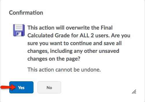 - Click Yes to confirm that you want to calculate the Final Grade.