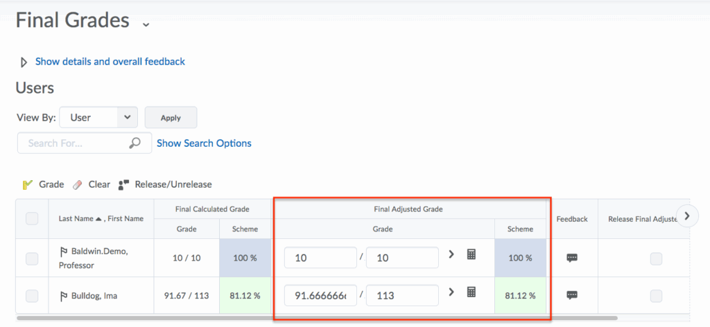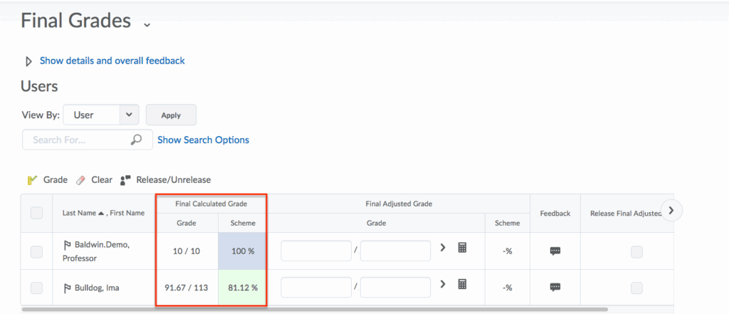 - The Final Calculated Grade now appears in the Final Adjusted Grade column. You can make adjustments to grades in the column before releasing to students.
