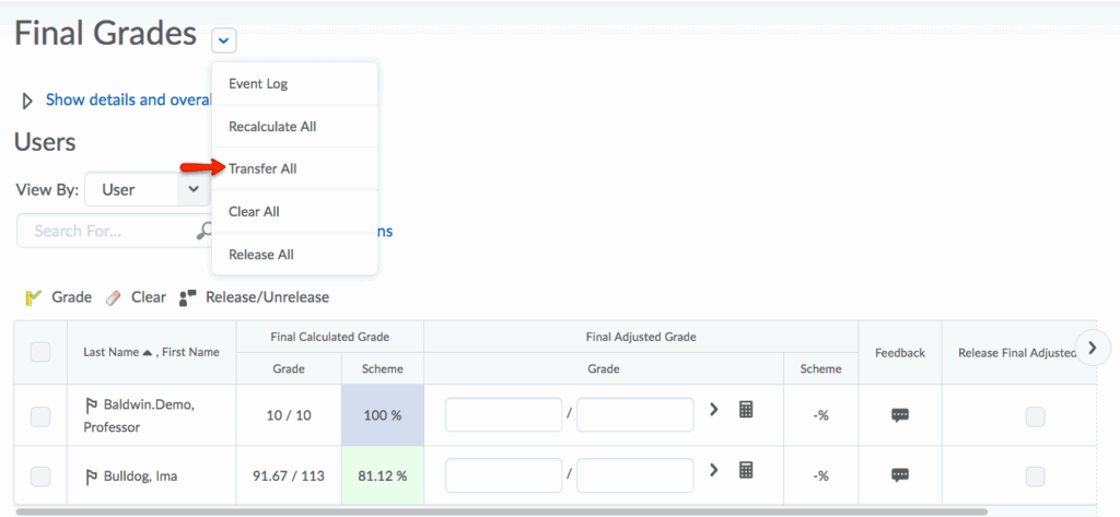- Optional: The Final Adjusted Grade column allows you to adjust final grades for individual students. To use this option, you should first transfer your Final Calculated Grade data into the adjusted column. To transfer, select the Final Grades dropdown menu and click Transfer all. Click Yes to confirm.