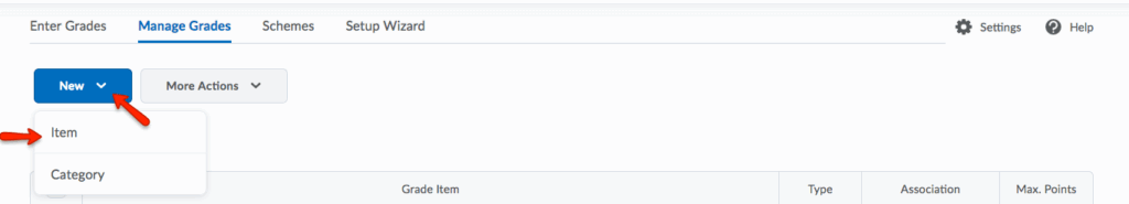 - Follow steps 1-3 in the Calculating a Midterm Grade instructions above: navigate to your course, select Grades from the course navbar, select the Manage Grades tab, then New and Item.