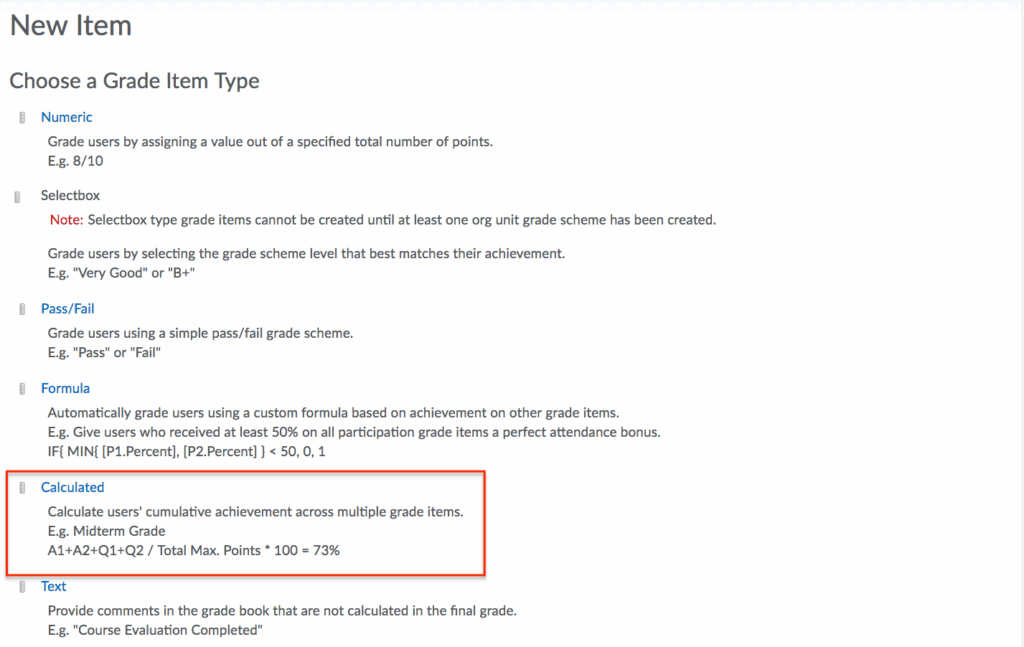 - Choose Calculated as the Grade Item Type.