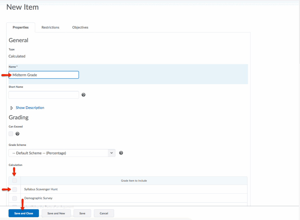 - Name the Calculated Grade Item. Scroll down and select the grade items you want to include in the calculation. If you want to select all, click the checkbox above the list of grade items. Click Save and Close to save the grade item.