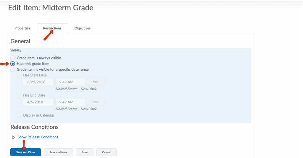 - If you would like to hide this new grade item from your students’ view: select the Restrictions tab of the grade item then click Hide this grade item. Click Save and Close to save the Restrictions for the grade item.