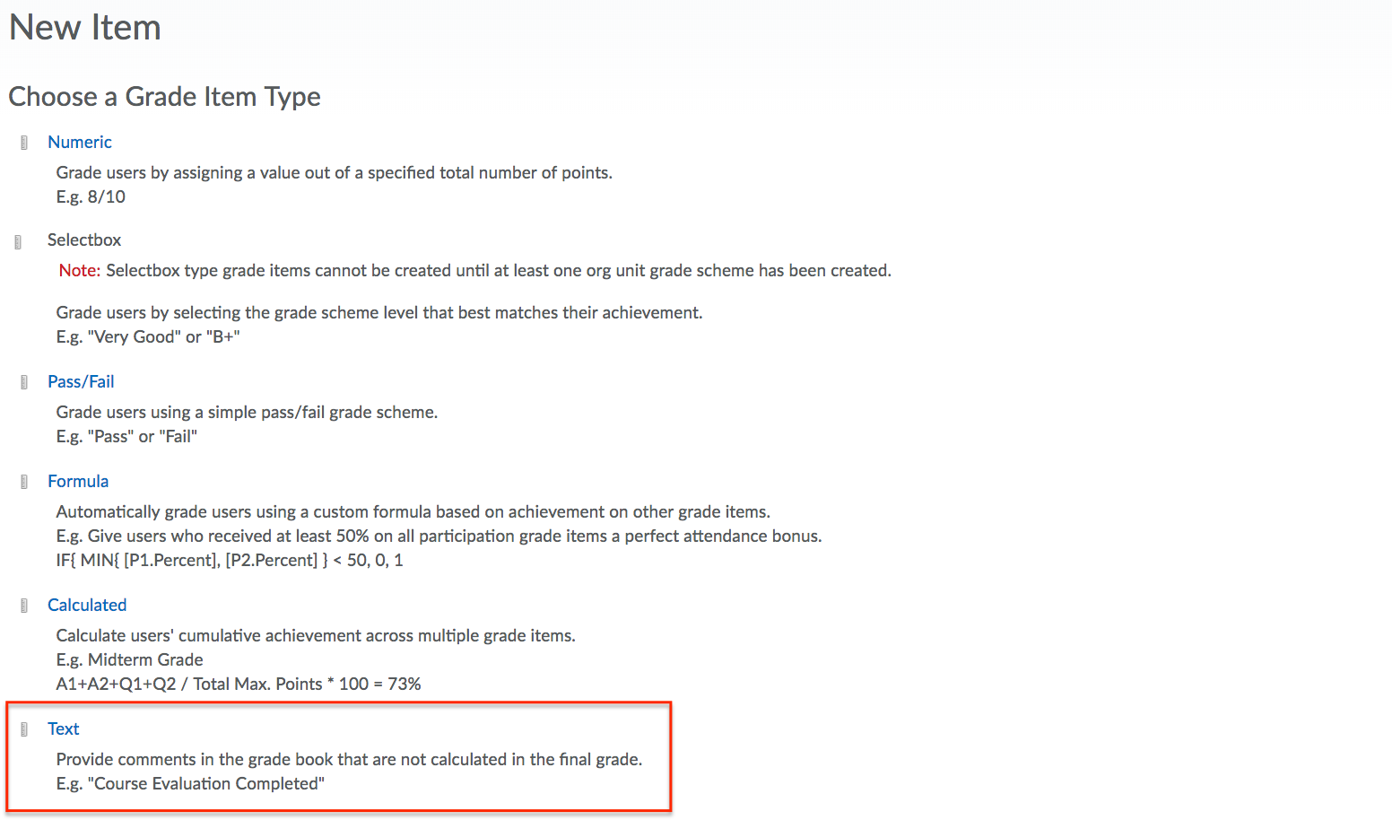 - Choose Text as the Grade Item Type.