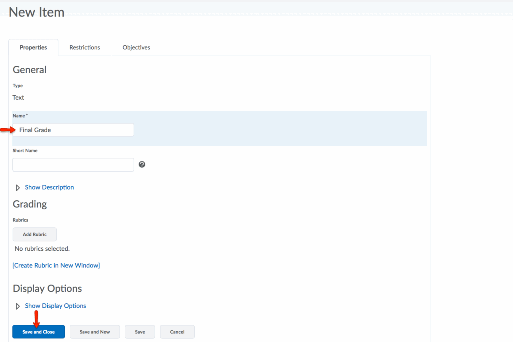 - Name the Text Grade Item. Click Save and Close.