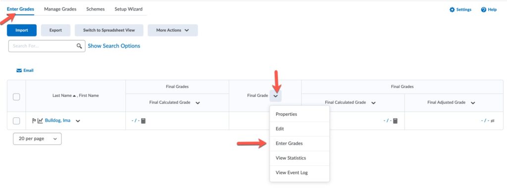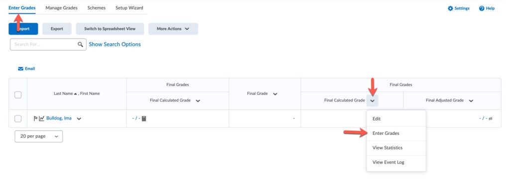 - Select the Enter Grades tab from the grades navbar. Locate the Final Calculated Grade column, click the dropdown arrow and select Enter Grades.