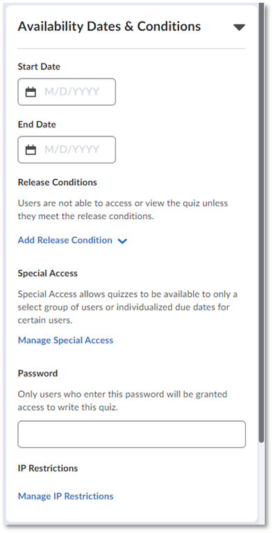 Allows you to require students to enter a password (set by you) to take the quiz. The password that you select will be the same for all students in your course. Make sure you communicate this information to your students before they are scheduled to take the quiz!