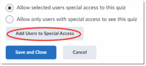 Allows you to determine access to an individual or a group of students. You can also use this to set specific settings that are different from your normal quiz settings. For example, choosing Allow selected users special access to this quiz would let you assign a makeup quiz only to certain students. To select those students who would be able to access this quiz, select Add Users to Special Access.
