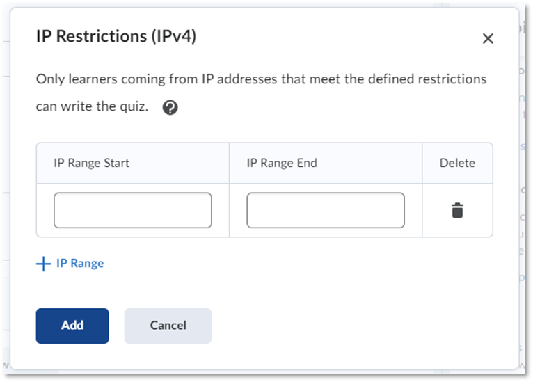 Allows you to restrict which IP ranges are permitted to access and take the quiz. We do not generally recommend using this option due to the complexity of identifying IP ranges that students will be using, especially if their testing location is not on campus. By default, quizzes are not set up with any IP restrictions and we recommend that you leave this setting unchanged.