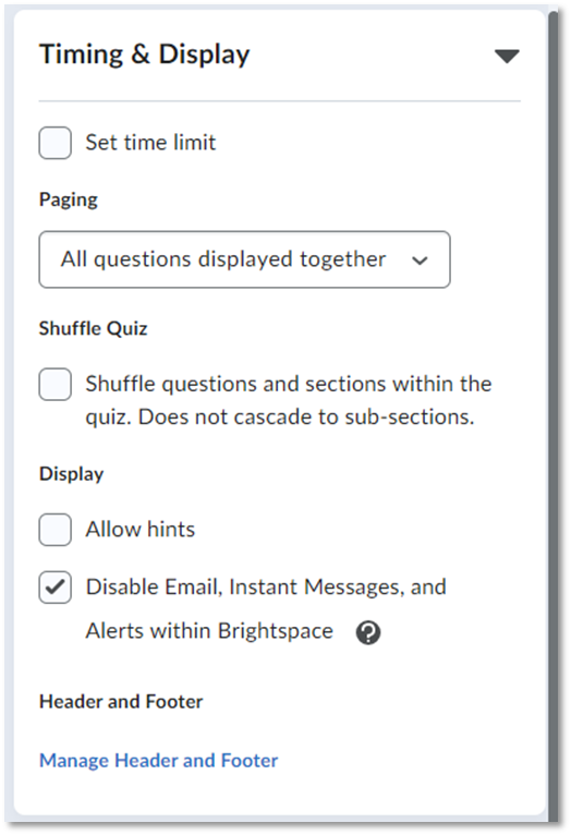 - Disable Email, Instant Messages, and Alerts within Brightspace: If you turn on this option, learners cannot access the eLC Email, Instant Messages, or their eLC alerts if the have a quiz attempt in progress.
