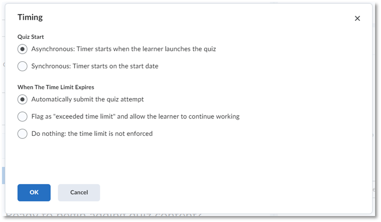 - Quiz Start: Asynchronous is the default setting and allows students to attempt the quiz whenever they wish during that quizzes’ availability window. Synchronous means that all students will be taking the quiz at the same time, and therefore the timer will start counting down automatically. We generally do not recommend synchronous settings for quizzes.