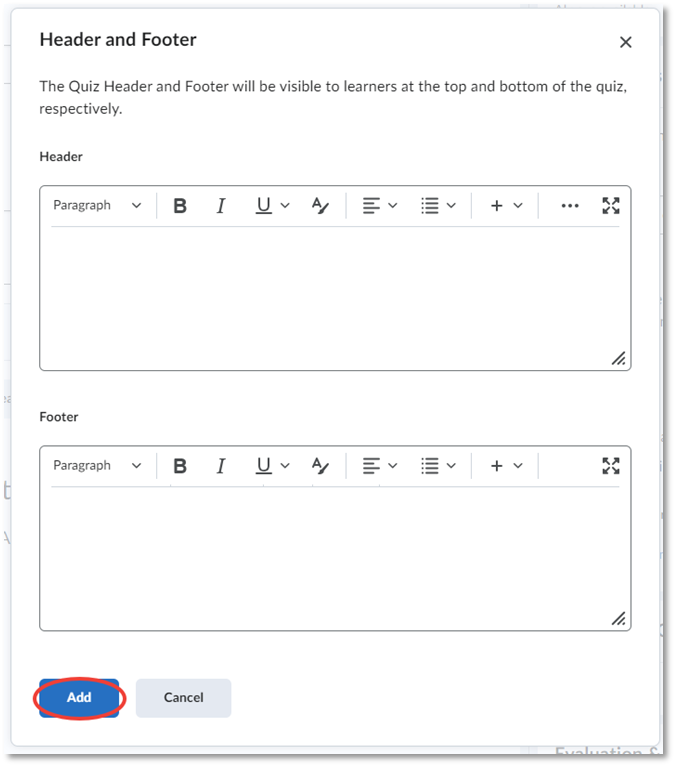 Select Manage Header and Footer to open an editing pane. Here, you can type and format a header and footer that will appear at the top and bottom of your quiz. Select Add once you are finished to save it to the quiz.