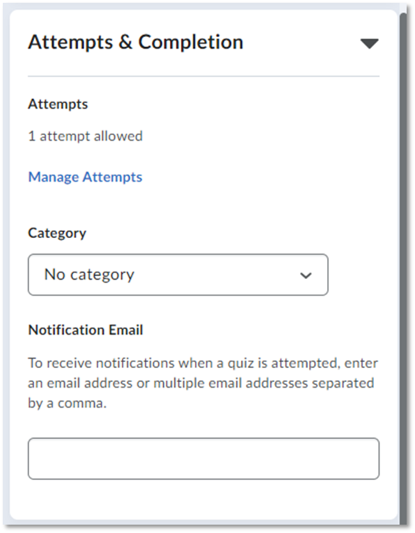 Use these options to control how many times a student may attempt a quiz, and to control how a student’s grade is affected by taking multiple attempts. By default, a quiz will allow 1 attempt. Select Manage Attempts to open more options.