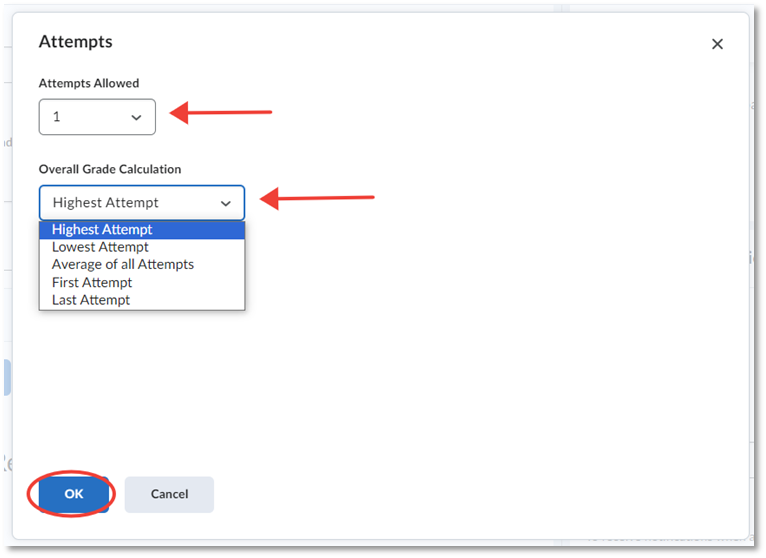 - Attempts Allowed: Change the number of attempts a student may take. You can choose from 1-10, or unlimited.