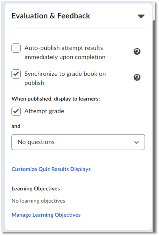 If your course has learning objectives input into eLC, you can associate this quiz with one of those learning objectives here. Select Manage Learning Objectives to select them.