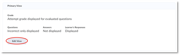Primary View: This is the display shown to students immediately after they complete the quiz. You can Edit View to provide a custom message, change the questions they can see, or choose to show class averages and/or grade distributions if you wish.