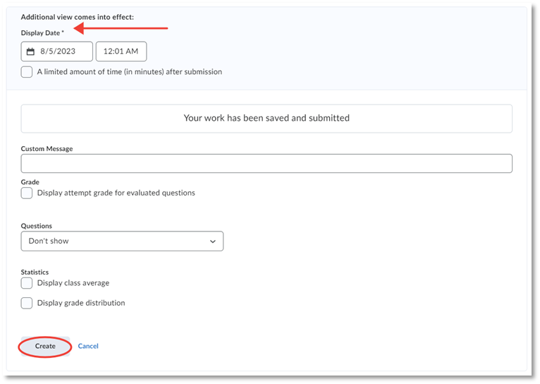 Additional View: This is an optional view that students will see at a later time after the quiz is completed. Select + Additional View to open the editor and create your additional view. Note that additional views need a display date to become active. This is how you determine when the additional view is available to students.