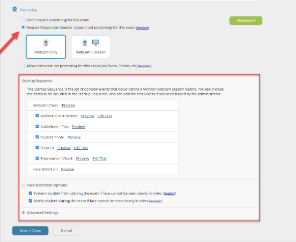 - Select the option to Require Respondus Monitor (automated proctoring) for this exam. Your screen will expand to provide additional options (e.g., Startup Sequence, Facial Detection Options, and Advanced Settings).