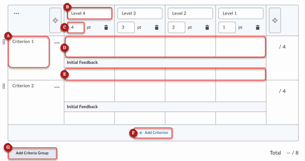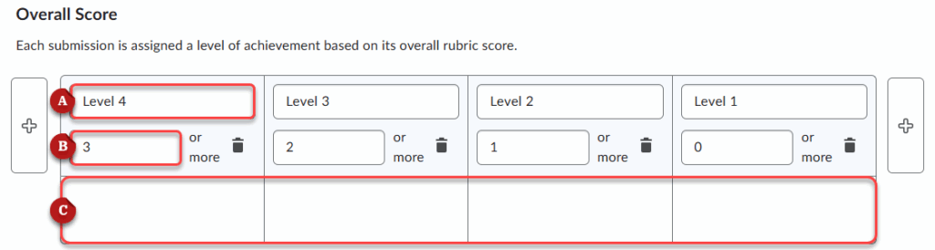 - Type the criterion labels for the individual levels e.g. “Meets Expectations,” “Exceeds,” et