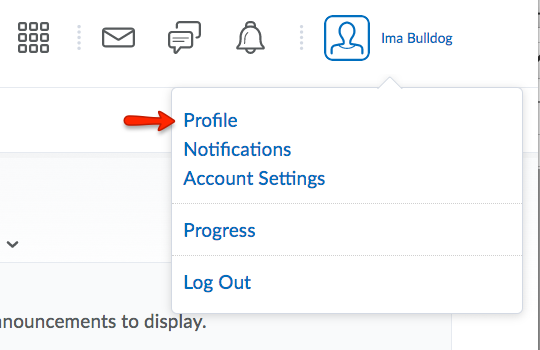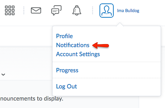 Notifications alert you to activity within your eLC courses. You can choose to receive a periodic summary of activity or instant notifications as things happen. To change your notification preferences, first click your profile picture and name. From the dropdown menu, select Notifications.