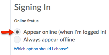 - Under Signing In, select your Online Status: Appear online (when I’m logged in) or Always appear offline.