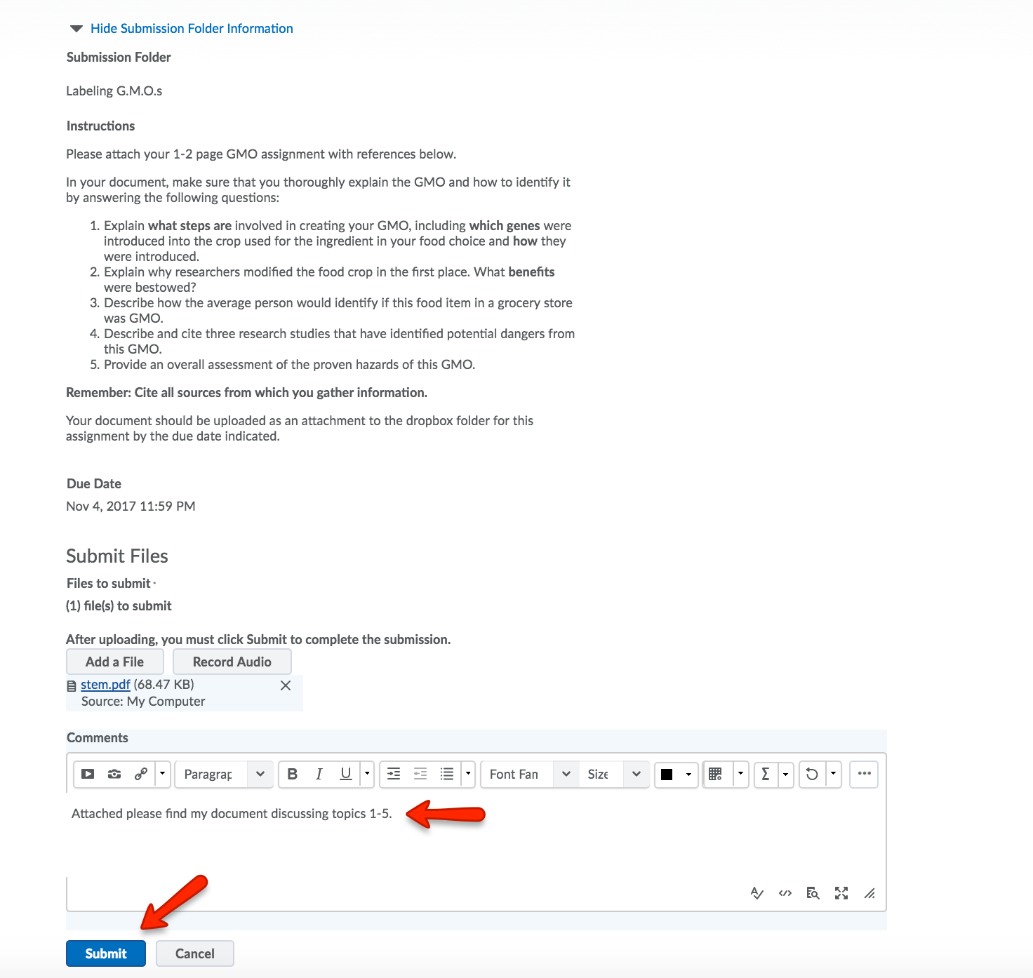 Please note: Instructors may place restrictions on the submission folder such as a establishing a range of dates during which the assignment may be submitted, limiting the number of documents submitted into one folder, specific file types or requiring tasks that must be completed before the drop box opens.