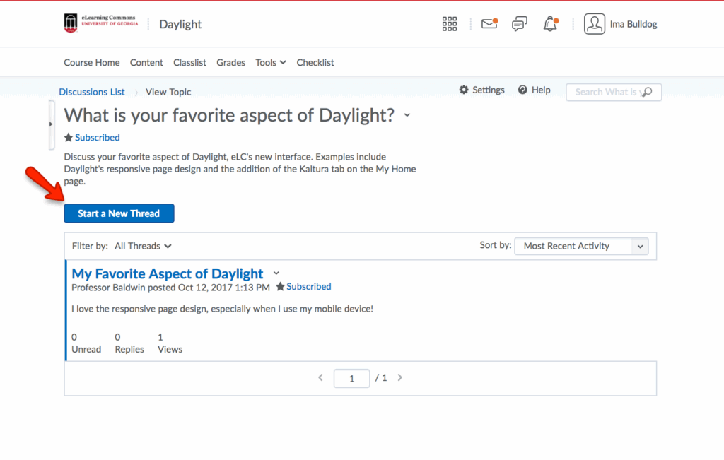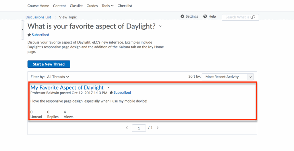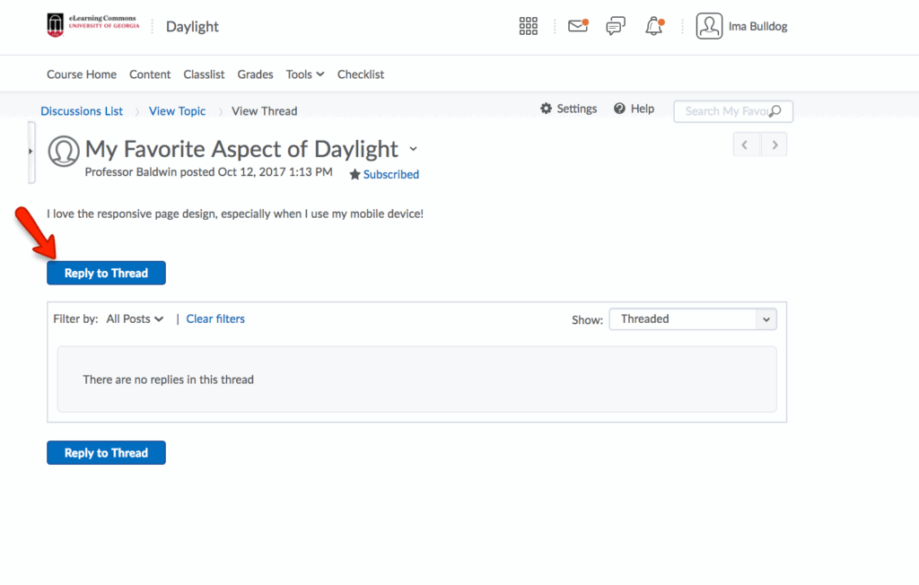 - To Respond to a discussion post, open the thread by clicking on the title. Click on Reply to Thread.